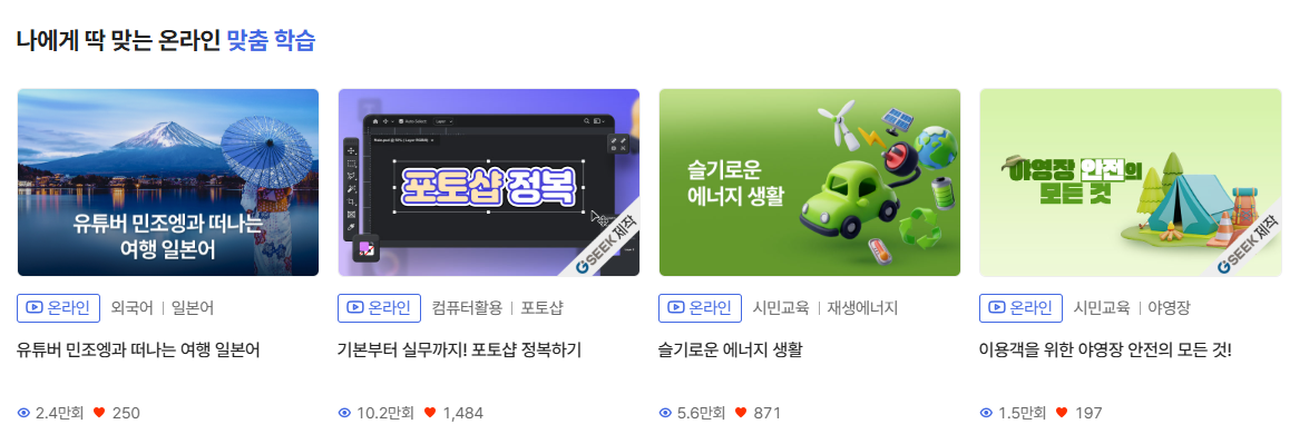 비용 부담 없이 양질의 강의를 듣고 싶은 분이라면 지금 바로 GSEEK에 접속해 보세요. 특히 학습 동기만 있다면 언제든 시작할 수 있어요.