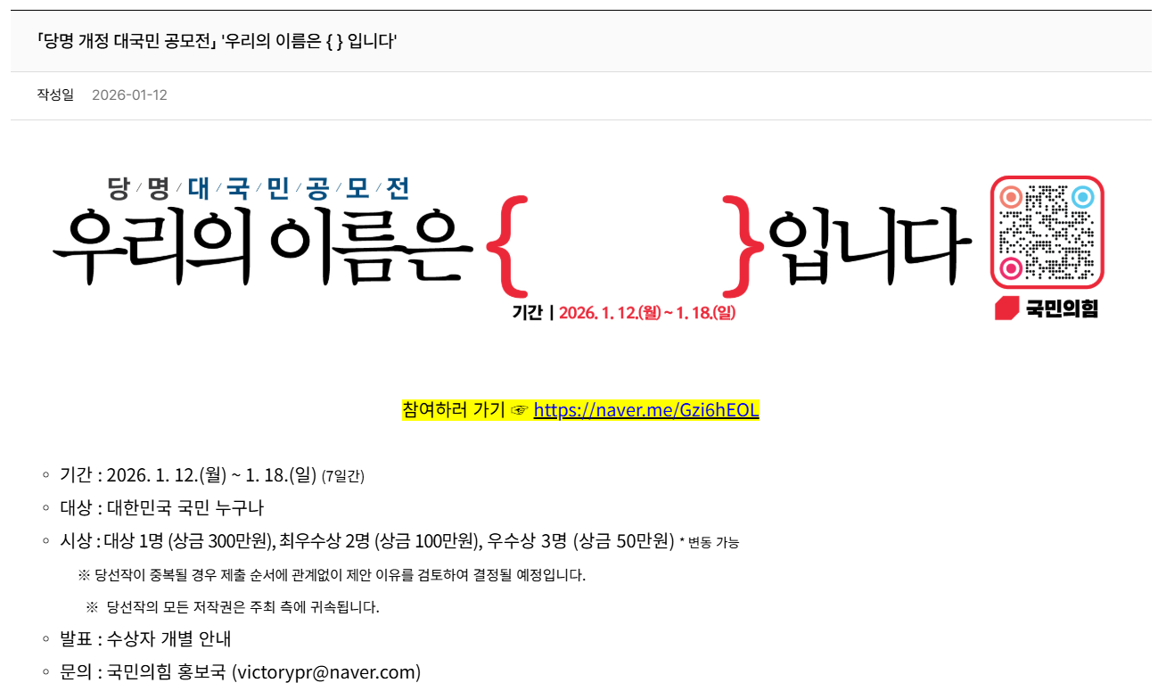 이번 ‘국민의힘 당명 공모전’은 시민 누구나 정치에 직접 참여할 수 있는 드문 기회입니다.