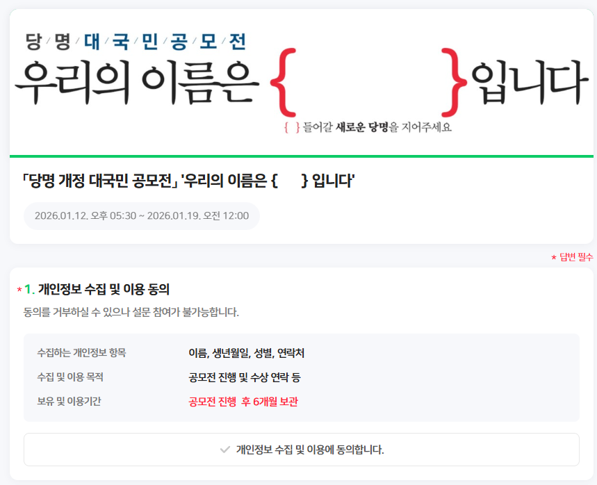 이번 공모전의 정식 명칭은 ‘당명 개정 대국민 공모전’입니다.